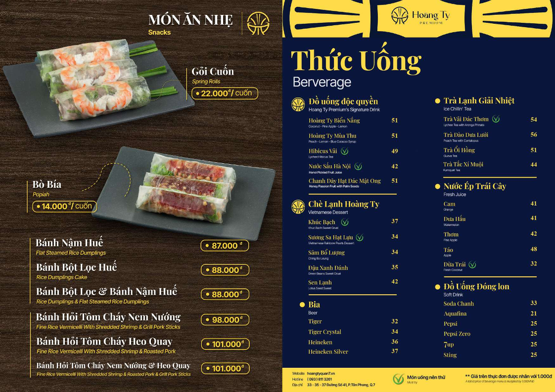 Welcome to Hoang Ty Premium Restaurant, a culinary gem located at 33 Đuong so 41, Tan Phong, Quan 7, Ho Chi Minh. This restaurant offers a delightful menu that celebrates the rich flavors of Vietnamese cuisine.