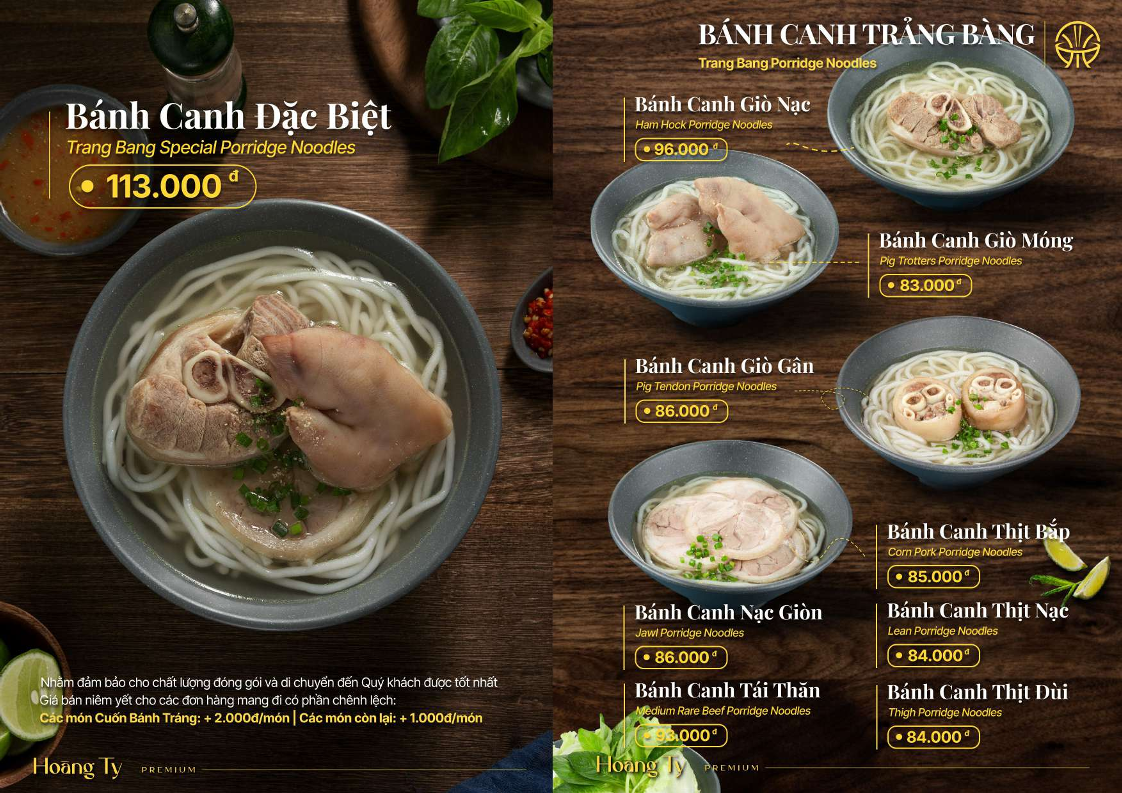 Highlights include the irresistible Combo Hoàng Mao, available in two sizes, and the savory Salmon Hotpot, which is perfect for sharing. For noodle lovers, the Bún Bò Hoàng Ty series stands out with options like the Special Beef Rice Noodles and Bún Bò Giò Gân, each brimming with tender beef and aromatic herbs.